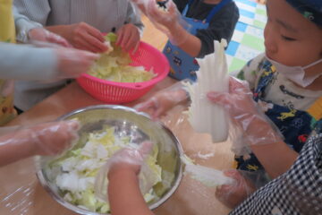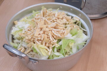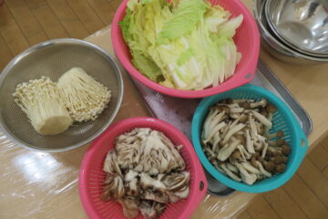 さあ、ちぎったきのこや白菜をお鍋に入れるとお山のようになりました。
