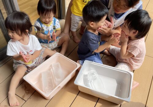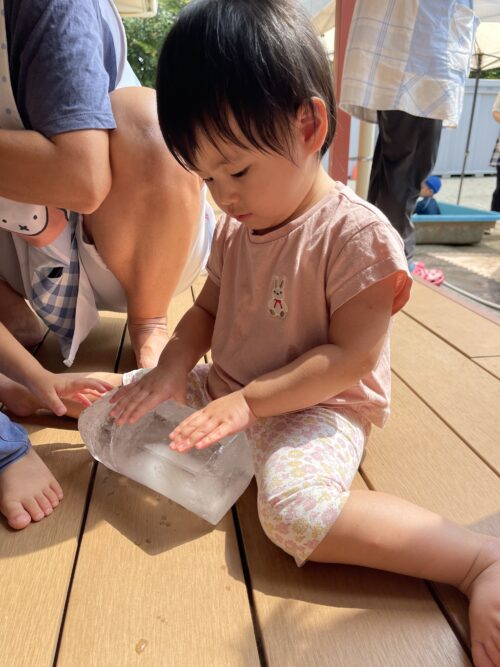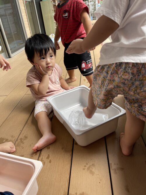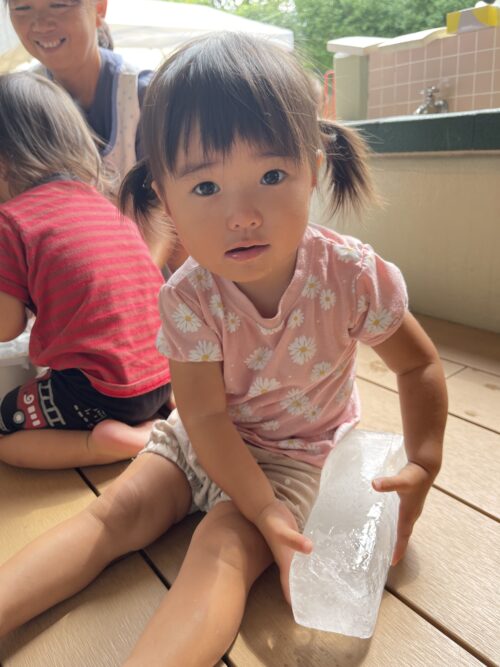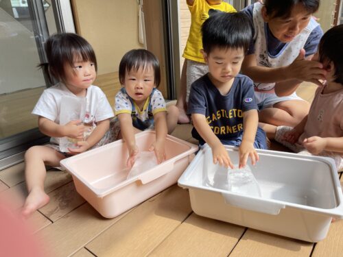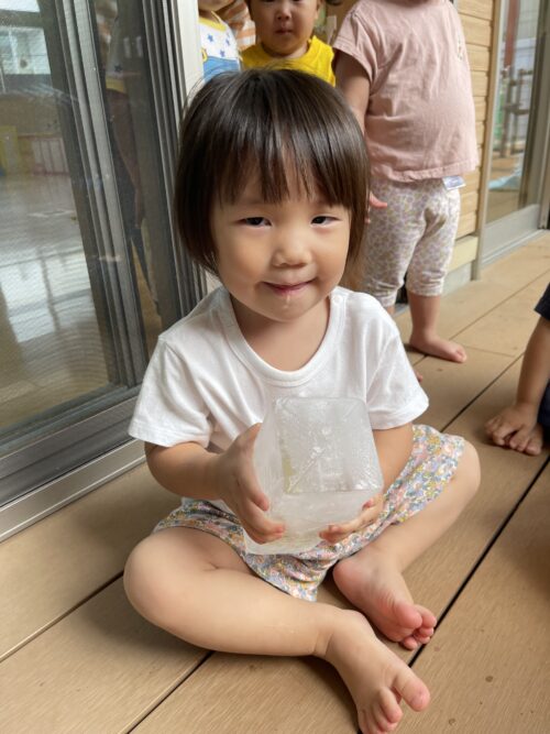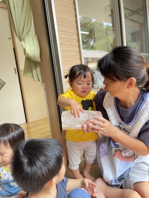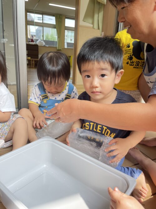 牛乳パックで作った大きな氷を触ると、みんな「ちゅめたーいっ!」とびっくり仰天✨思わず手を離す場面も😍