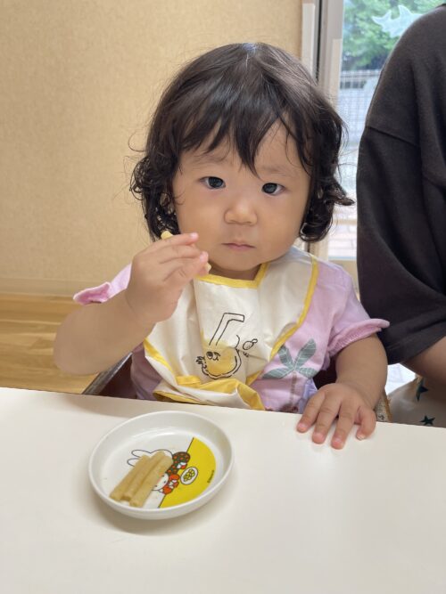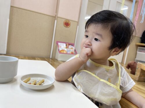 朝のおやつを覗くと・・つかみ食べがすっかり上手になっていたつくし組さん😊