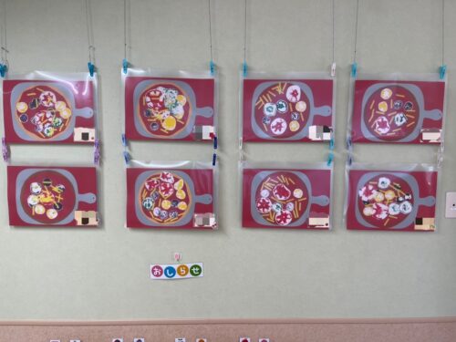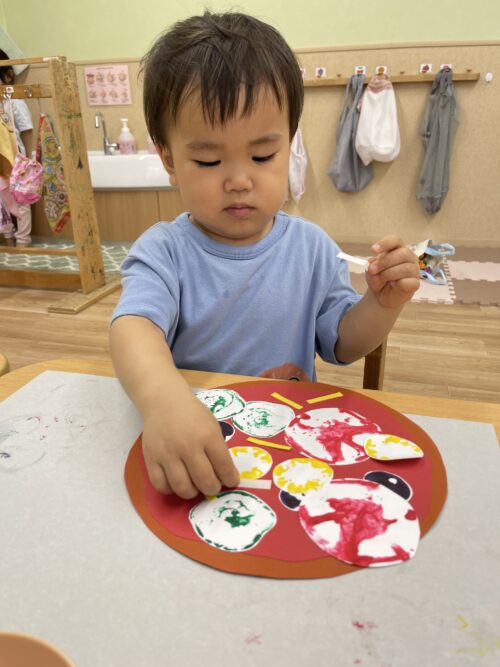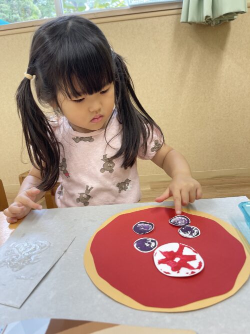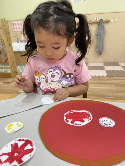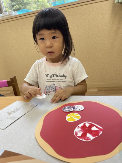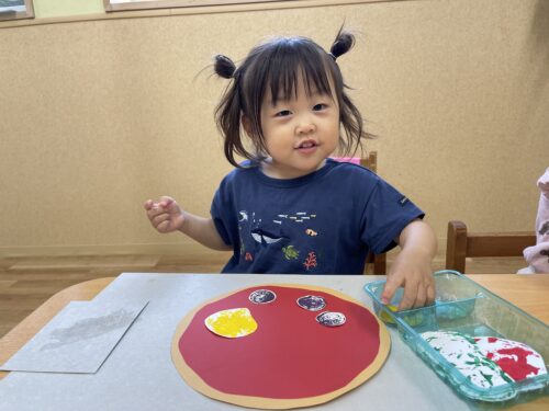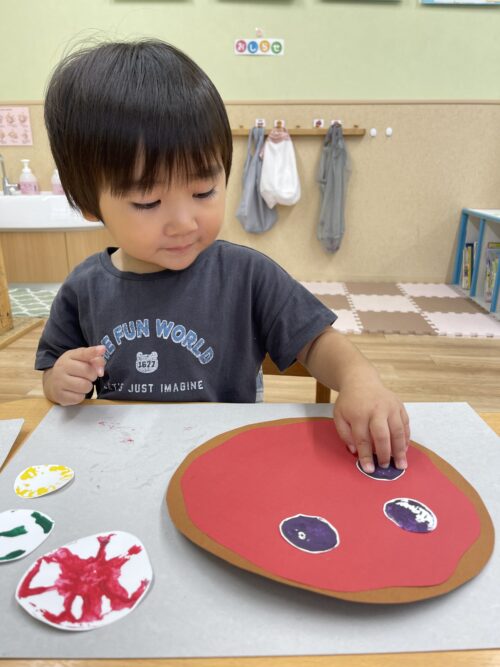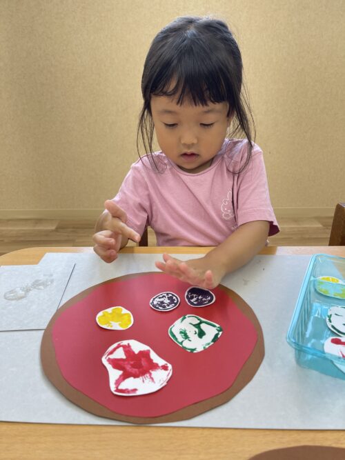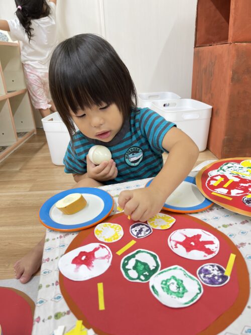 本物の野菜に触れ、断面を知り、自分でスタンプしたことをよく覚えており「これはナス~!」「ピーマンものせる~!」と夢中でピザを完成させてくれました✨