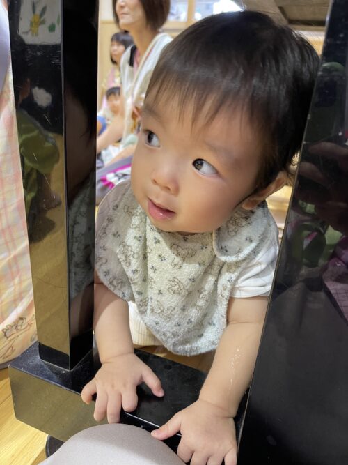 ぼくもっとよく見えるところにいくの😊と、ピアノまでよいしょ、よいしょ👶