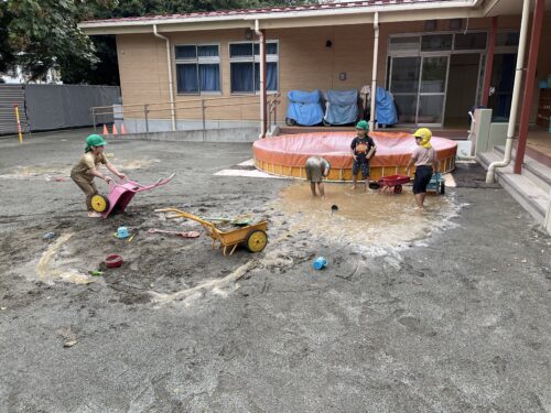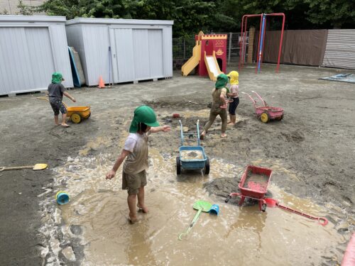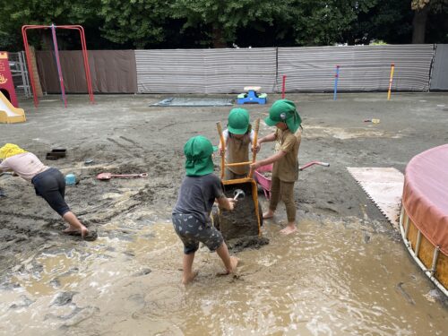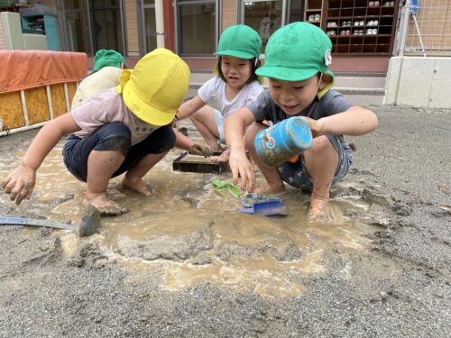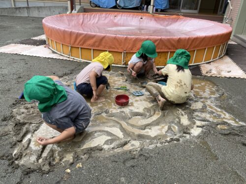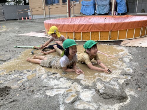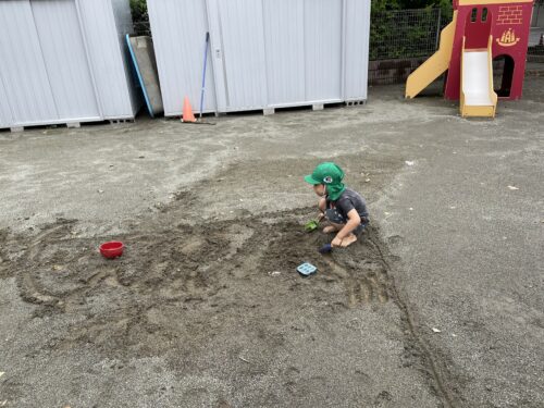 最終日こそプール!!と願っていましたが少し涼しかったため、うみやま組は泥んこあそびをしました♪