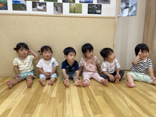 今回のリズムあそびでは、たんぽぽ組さんが並んで座り、お兄さん姉さんの動きを真剣に見つめていました。