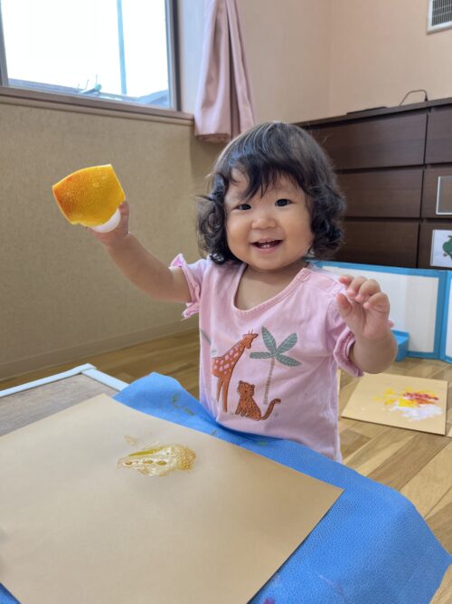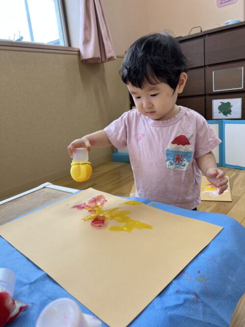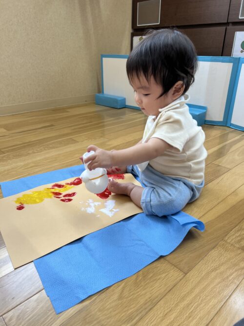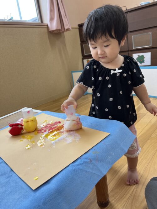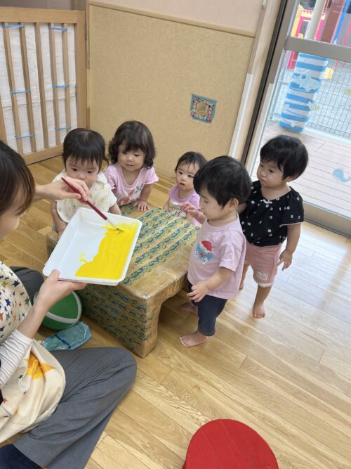絵の具の感触に驚いたり、楽しんだりしながらポンポンスタンプをしました✨保育者が絵の具を混ぜ混ぜするとじーーっと見に来るみんな✨