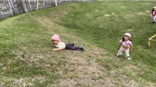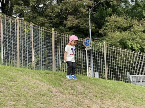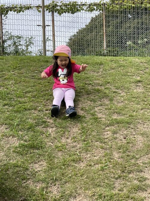 公園に到着すると芝生の斜面に一直線!芝滑りが始まりました😊