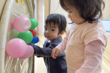 つくし組の保育室に、手作り玩具が出現しました✨楽しみながら手指をたくさん使えるように、粘着テープにボールをペタペタします。