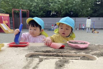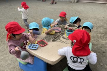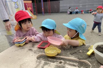 最近のブームはお砂場のテーブルです。よいしょよいしょと椅子に座り、お砂遊びをしています♪
