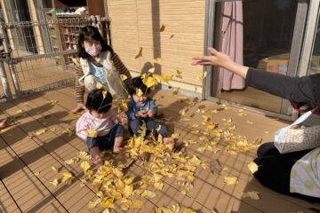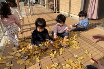 今日つくし組はイチョウの葉を集めて、テラスで落ち葉あそびをしました🍂
