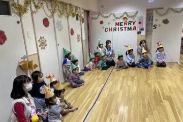 今日はみんなが楽しみに楽しみに待っていたクリスマス会がありました😍全クラス可愛いクリスマス帽子を被りプレイルームに集まりました😊